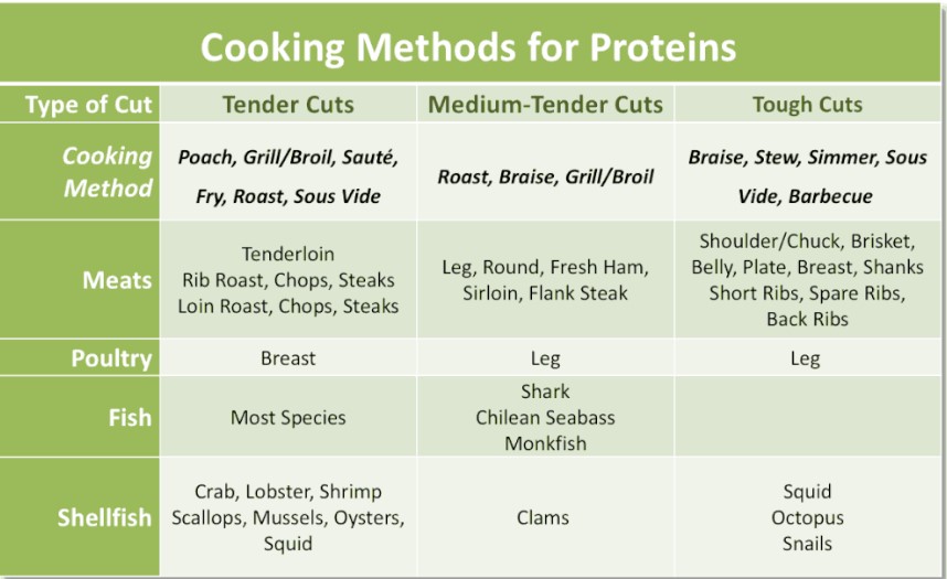 Panduan memasak untuk potongan daging yang empuk (tender cuts), agak empuk (medium tender cuts), dan alot (tough cuts) seperti Pro, menurutCulinary Pro.