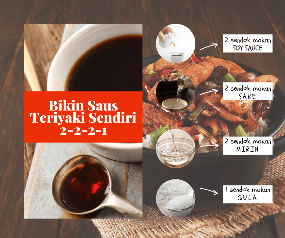 Saus Teriyaki Bikinan Sendiri = 2 Sendok Makan Soy Sauce + 2 Sendok Makan Sake + 2 Sendok Makan Mirin + 1 Sendok Makan Gula