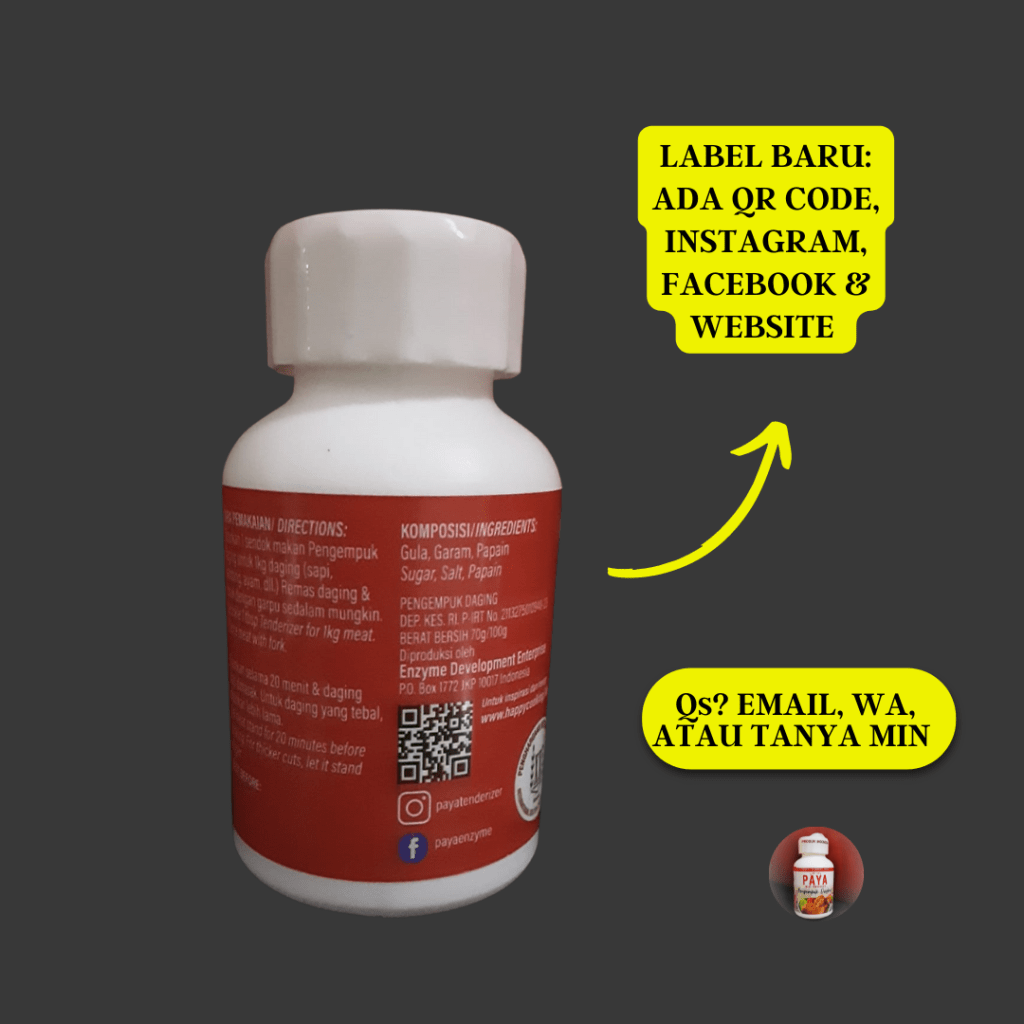 Kalau ada pertanyaan kirim email, WhatsApp, atau hubungi kami melalui jalur akun social media PAYA Meat Tenderizer (Pengempuk Daging) di Instagram, Twitter, Facebook.